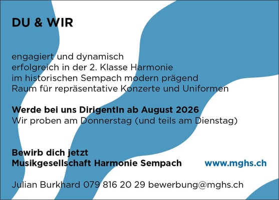 Am 26. April 2026 spielen wir in der Pfarrkirche Sempach ein Kirchenkonzert mit unterhaltsamen und schönen Melodien. Wir freuen uns!