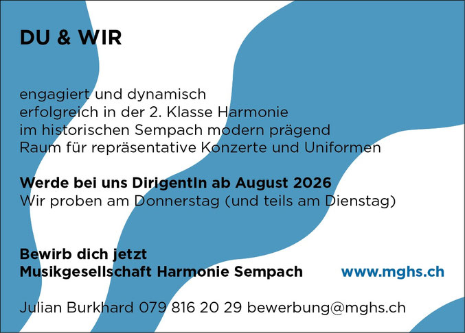 Wir suchen eine motivierende und kompetente Persönlichkeit, die uns musikalisch fördert und fordert, selbst neue Ideen mitbringt und das Spektrum zwischen Tradition und moderner Zukunft schätzt und inspiriert. Die Probetage wie der Probenumfang sollen in etwa beibehalten werden. Wir erwarten von unserer zukünftigen Direktion die übliche blasmusikalische Ausbildung, welche noch nicht zwingend abgeschlossen sein muss.