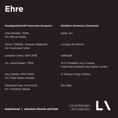 Mit viel Spielfreude, Lockerheit und Überzeugung führten wir unsere Gäste durch den zweiten Konzertteil. In "Sister Act" sah man sich mit Whoopy Goldberg singend im Nonnenkloster und in "Salsa du Démon" tanzten Belzebuth, die Vampierin und die Hexe zu teuflischen Klängen um die Wette. Nach dem Bösen das Gute: Das weltberühmte "Halleluja" von Leonhard Cohen berührte und beruhigte nach dem diabolischen Spiel. Die Solisten Simon Duss, Dario Helfenstein, Christine Fleischlin, Peter Kunz und Tim Bauhofer begeisterten als Dixieland Jazz Formation in "At a Dixieland Jazz Funeral". Mit Melodien von Ray Charles und "Sky High" hoben wir gegen Konzertende nochmals ab und bedankten uns mit zwei Zugaben bei unserem Publikum, welches durch Manuel Burkhard gekonnt und unterhaltend durch den Abend geführt wurde.