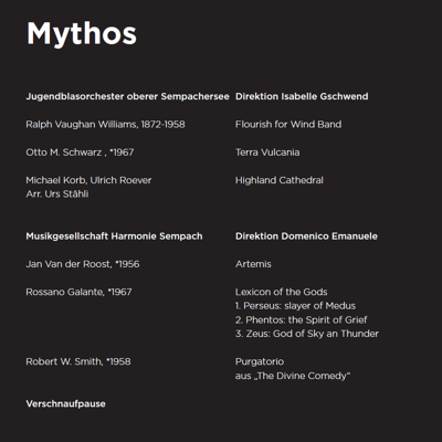 Wir unternahmen mit unserem Dirigenten Domenico Emanuele das Zepter mit "Artemis" und huldigten der griechischen Göttin mit einem besonders lyrischen Mittelteil. Weiter gings mit griechischer Mythologie: In "Lexicon of the Gods" verarbeitete Rossano Galante musikalisch die Charakteren von Perseus, Phentos und Zeus. Heroische, dramatische Töne wechselten sich ab mit melodiösen, ruhigen Klängen.