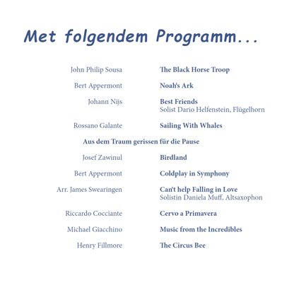 Die berührende Ballade «Best friends» von Johan Nijs liess das Publikum dann in einen Tagtraum versinken. Die Solostimme spielte der Solist Dario Helfenstein mit dem Flügelhorn auf gefühlvolle Art, sodass die sanfte Melodie für alle ein paar ruhige Minuten bot. Dass die rührende Ballade bei manchen zum Seelenspiegel wurde, zeigt der anschliessende grosse Applaus. Bevor das Publikum von der Pause aus dem Traum gerissen wurde, überzeugte die MGHS mit dem majestätischen Werk «Sailing with whales», welches mit kraftvoller Musik die prächtigen Wellen des Ozeans widerspiegelte.