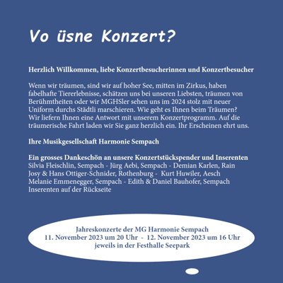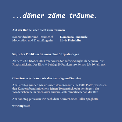 «Ond vo was träumsch du?», fragten die Musikantinnen und Musikanten ihr Publikum am Samstagabend und Sonntagnachmittag und boten dazu variantenreiche Stücke, die Inspiration boten, in die Welt der Träume zu versinken. Dabei führte die ehemalige Musikantin Silvia Fleischlin durch den träumerischen Abend und bereicherte die kurzen Pausen mit Hintergrundinformationen zu den verschiedenen Liedern. Den Auftakt machte das Stück «The black horse troop», bei welchem sich vielleicht die eine oder andere Zuschauerin ihren Traumprinzen auf dem Pferd vorstellte. Unter dem Dirigentenstab von Domenico Emanuele wurden die Zuhörerinnen und Zuhörer dann auf die stürmische Reise der Arche Noah mitgenommen. Bei «Noah’s ark» wussten die Musikantinnen und Musikanten mit Lautstärkenwechsel ein Abbild der gefährlichen Sintflut bis zur Zeit der Hoffnung zu schaffen. Das Stück mit vier Sätzen wird die Musikgesellschaft Harmonie (MGHS) auch am kantonalen Musiktag in Wolhusen im Mai 2024 zum Besten geben.